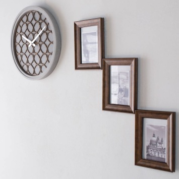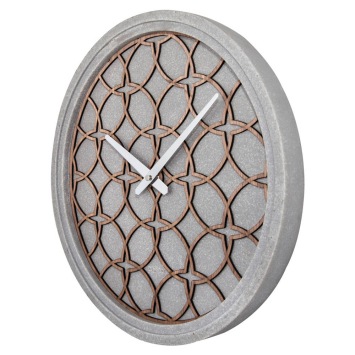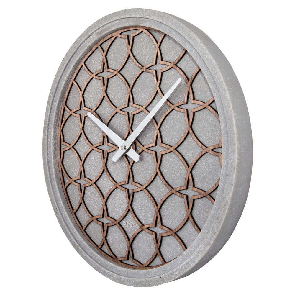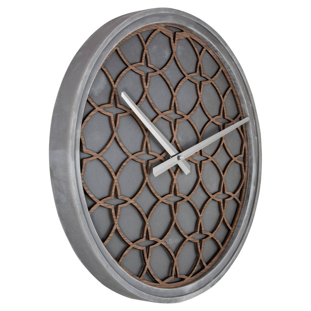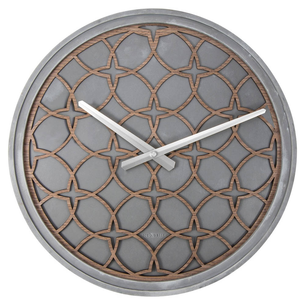 • Klok NE3212BR is een wandklok in een grijze betonnen (polyresin) uitvoering opgelegd met een houten design motief.