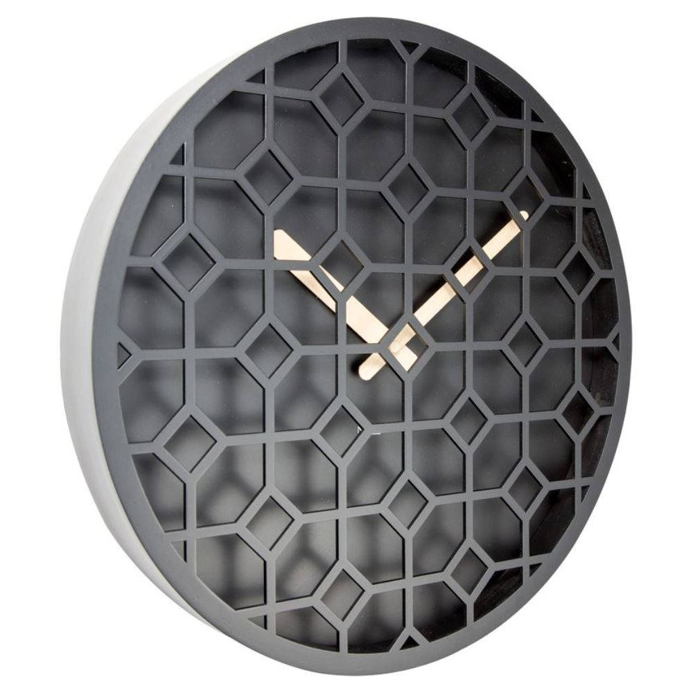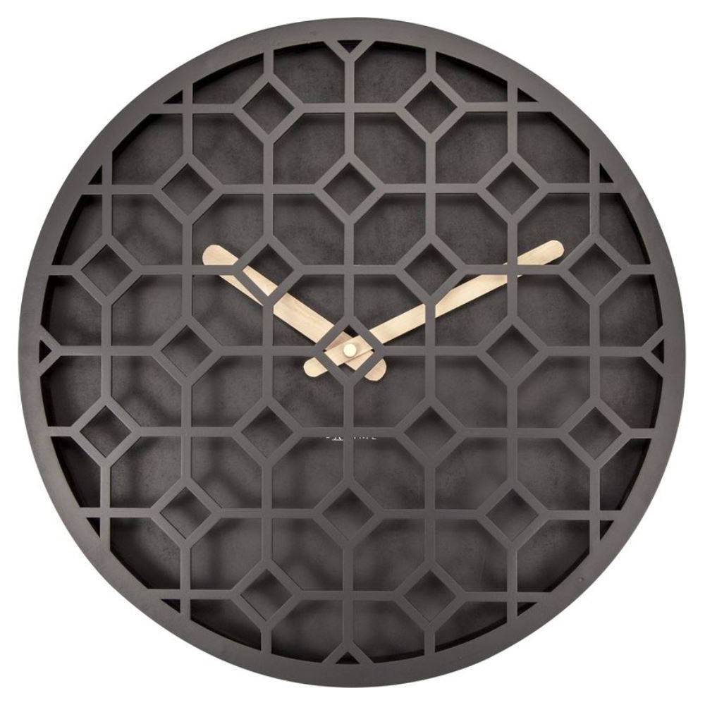 • De wijzers zitten achter een kooi-achtig houtpatroon.