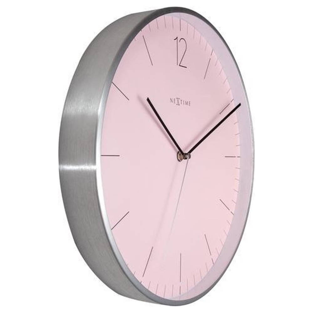 • Klok NE3254RZ is een wandklok met een geborstelde matte aluminium rand en roze wijzerplaat met opgedrukte zwarte urenmarkeringen.