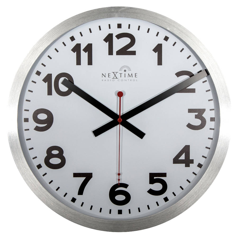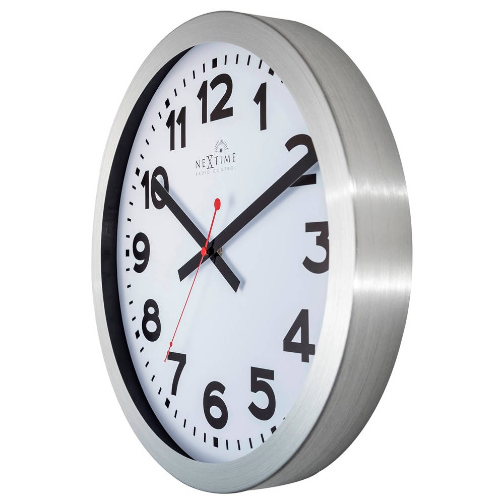 • Klok NE3999ARRC is een wandklok in stationsklok stijl met een gematteerde aluminium rand en een witte wijzerplaat met duidelijke zwarte opgedrukte cijfers.