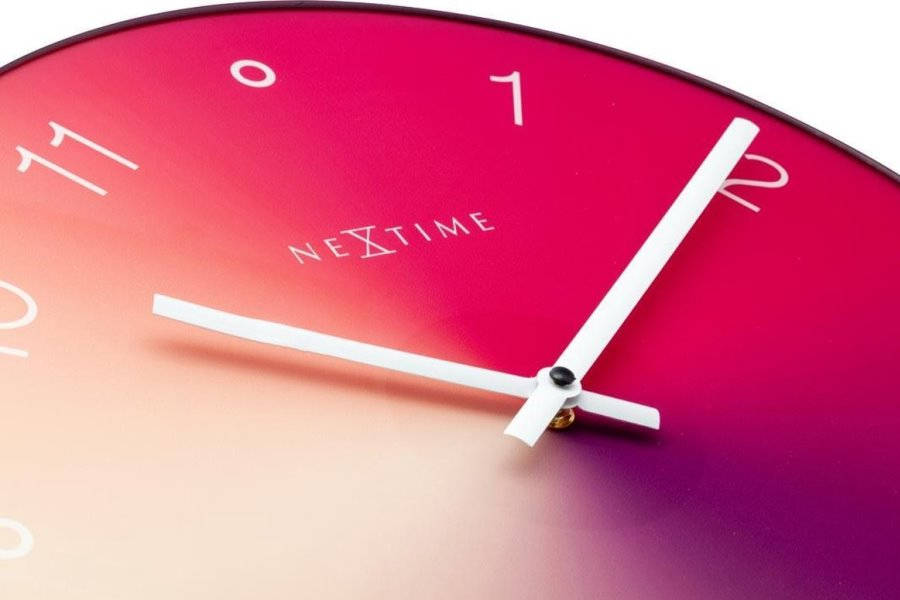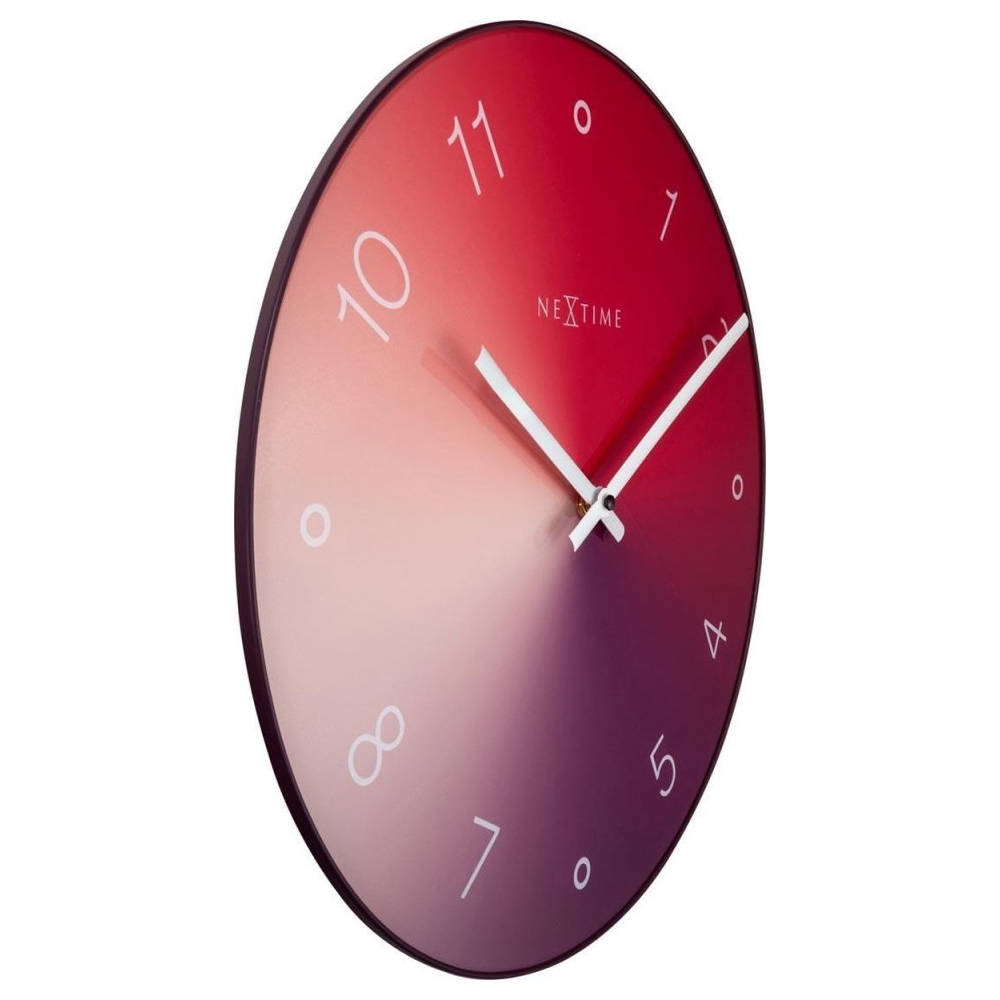 • Klok NE8194RO is een glazen wandklok bedrukt met een rood kleurverloop (rood-paars-roze) en witte cijfers en urenmarkeringen.