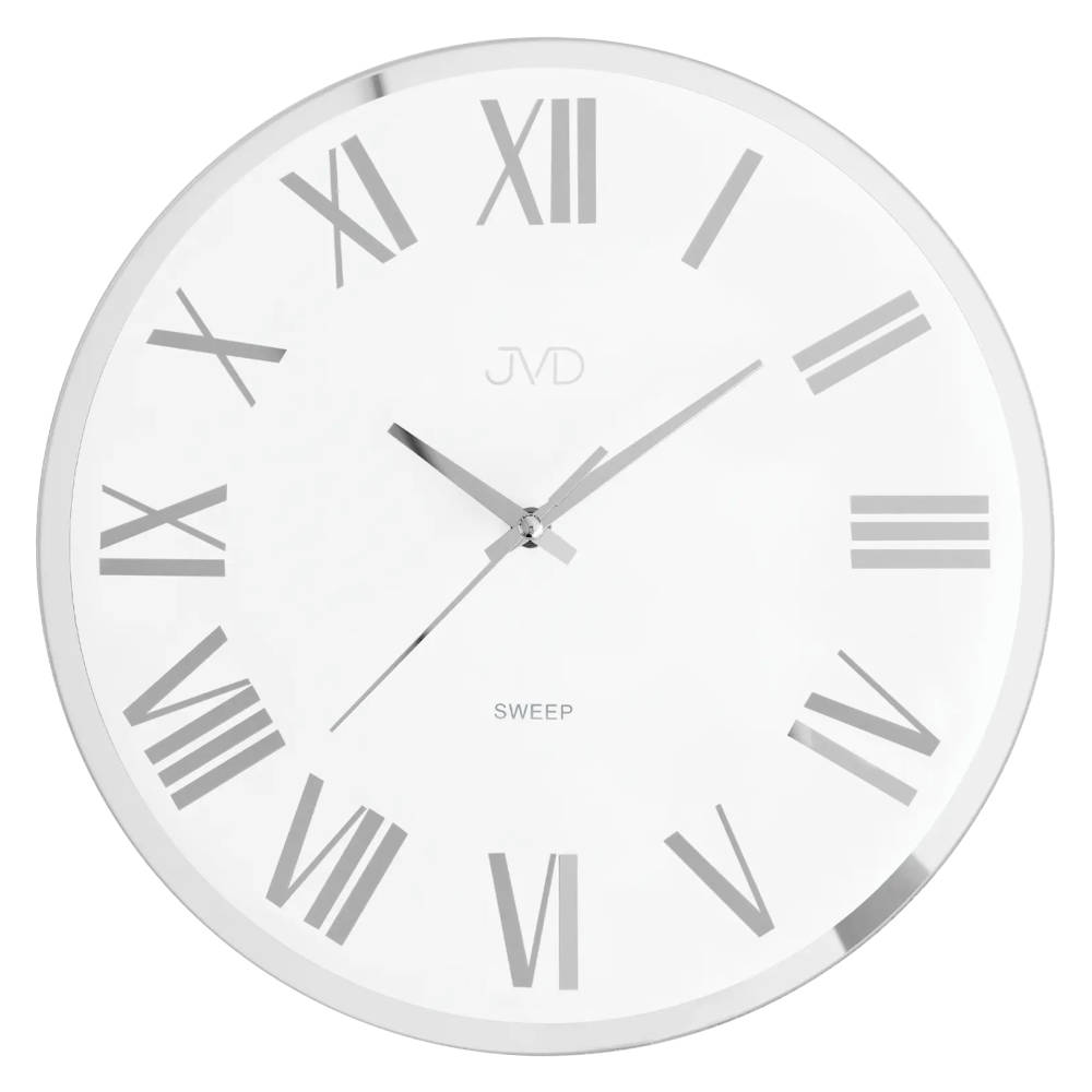 • Klok NS22006-3J is een wandklok in een wit bedrukte spiegelglas uitvoering met zilverkleurige wijzers.