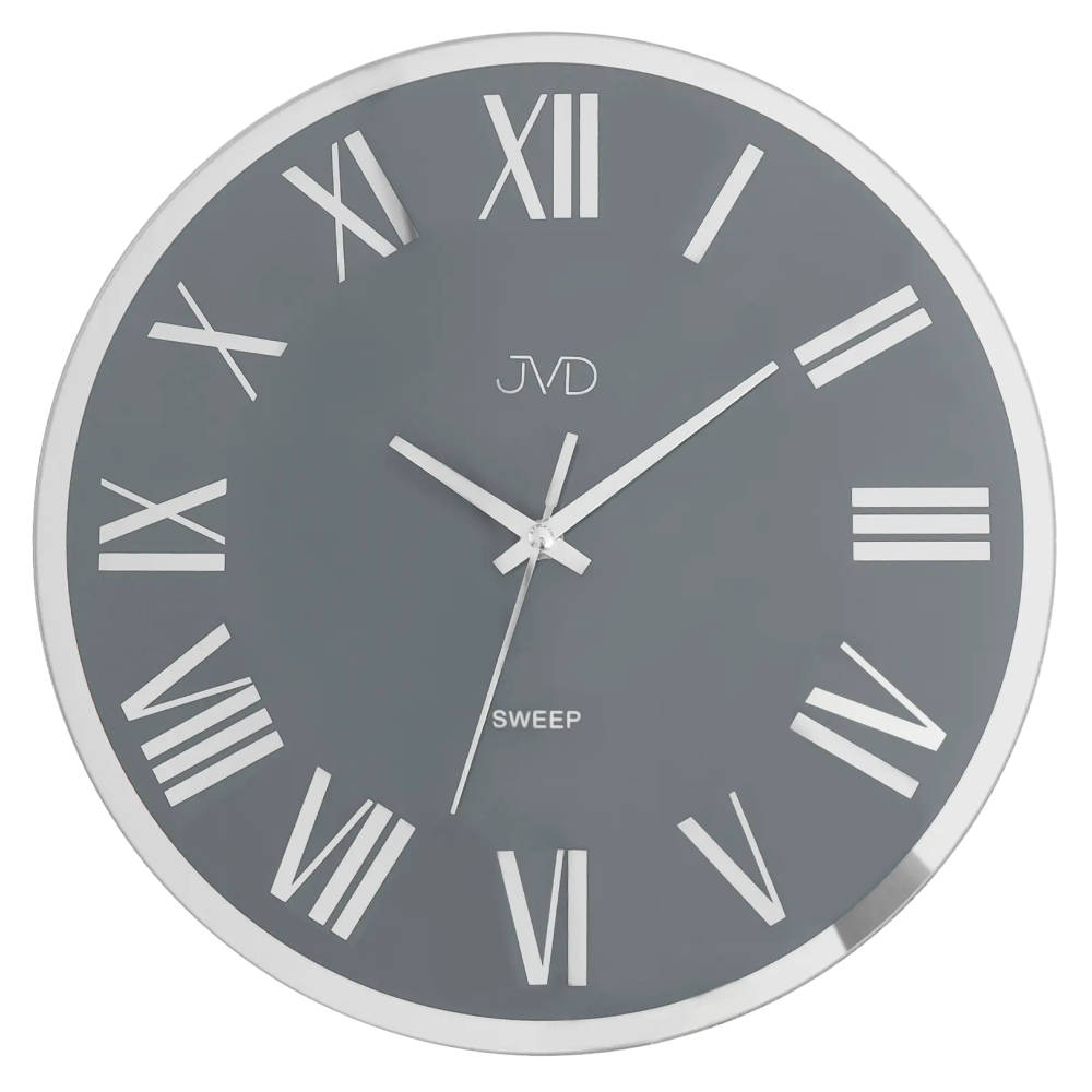 • Klok NS22006-4J is een wandklok in een grijs bedrukte spiegelglas uitvoering met zilverkleurige wijzers.