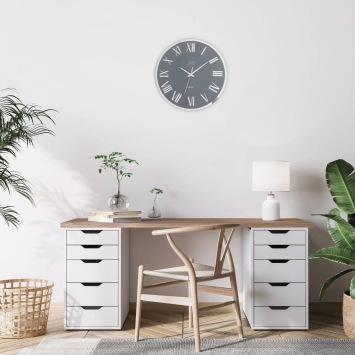 • Deze wandklok heeft een quartz uurwerk die functioneert op een meegeleverde kwaliteitsbatterij.