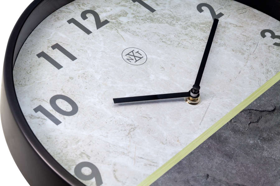 • Klok NX7338 is een wandklok met een mat zwarte metalen rand en wit-antraciet marmer motief wijzerplaat met goudkleurige streep.