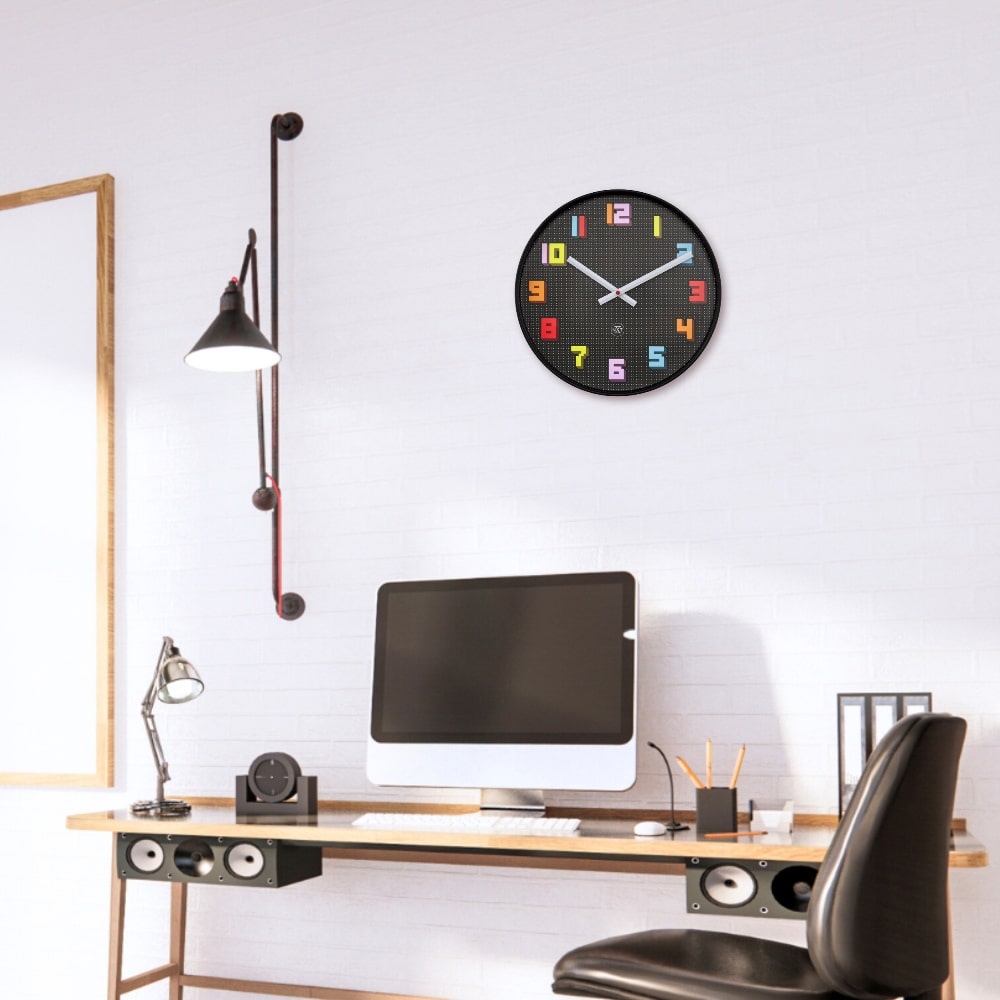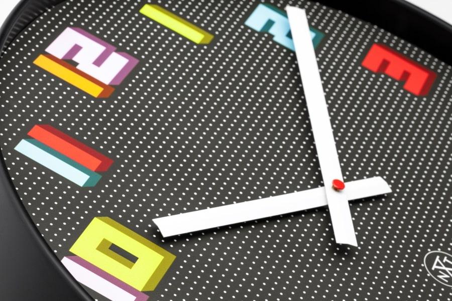 • De zwarte wijzerplaat is bedrukt met kleine witte stippen en kleurrijke cijfers waarmee het pixel design is gecreëerd.