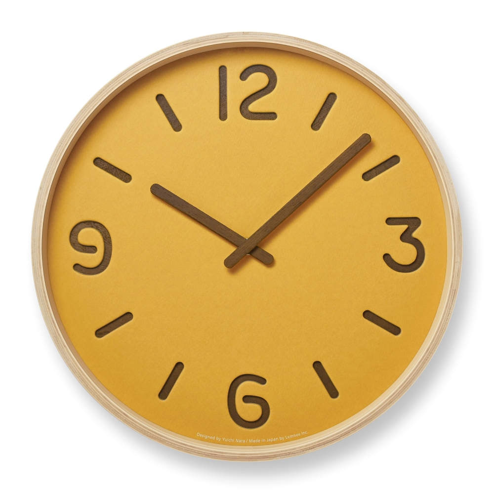 • Klok NY18-15YE is een licht houten design wandklok met een gele wijzerplaat en uitgefreesde cijfers en strepen.