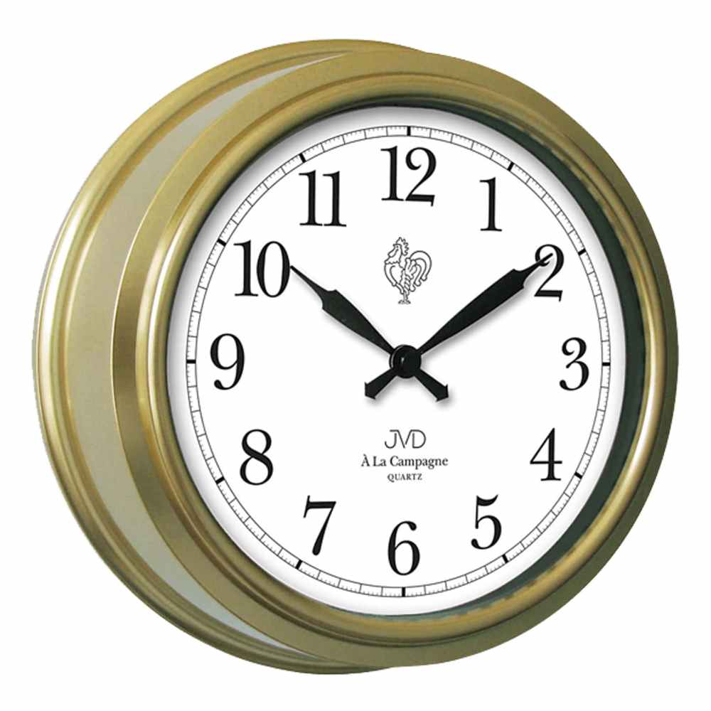 • Klok TS1238-2J is een wandklok met een diepe goud-messing kleurige kunststof rand en een vlak mineraalglas voor de witte wijzerplaat.