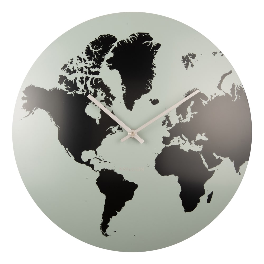 • Klok KA5889GR is een wereldkaart wandklok van gebold metaal in een grijze uitvoering met zwart opgedrukte wereldkaart en mat zilverkleurige metalen wijzers.