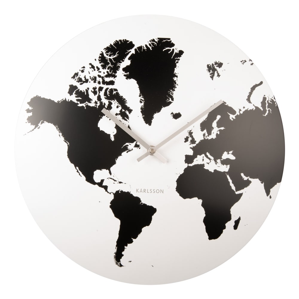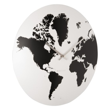 • Klok KA5889WH is een wereldkaart wandklok van gebold metaal in een witte uitvoering met zwart opgedrukte wereldkaart en mat zilverkleurige metalen wijzers.