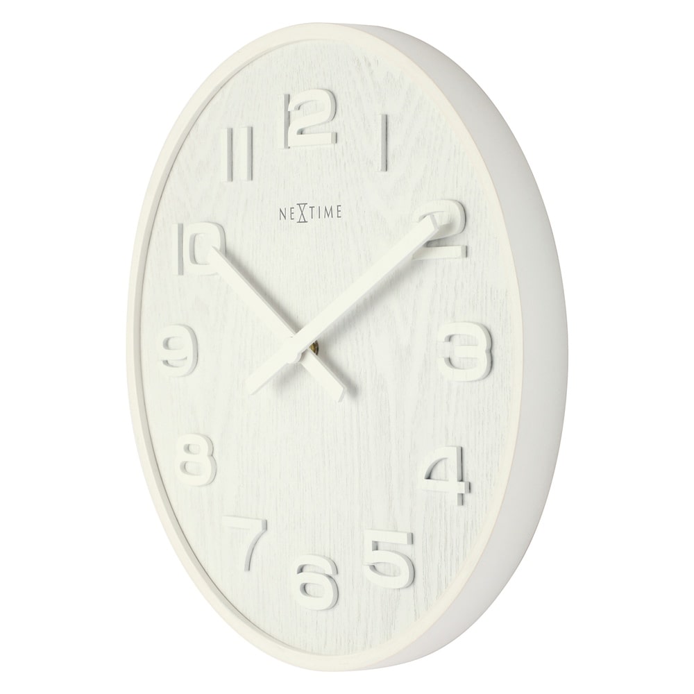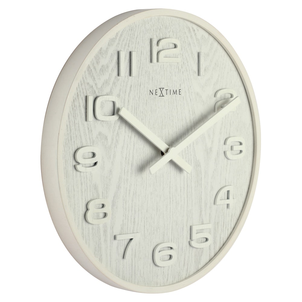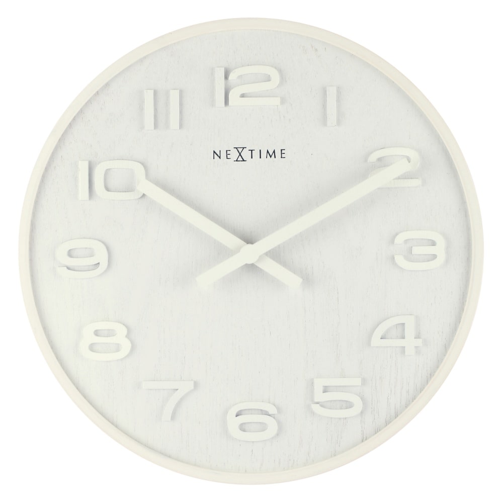 • Klok NE3096WI is een wandklok in een mat witte uitvoering met een houten rand, houten wijzerplaat met zichtbaar hout motief en houten wijzers.