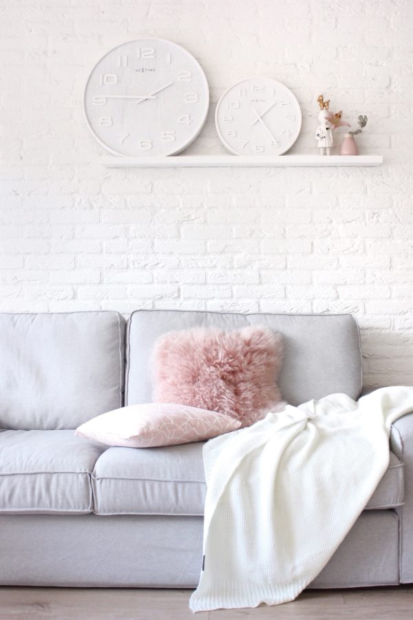 • De wijzerplaat is opgelegd met witte houten cijfers.