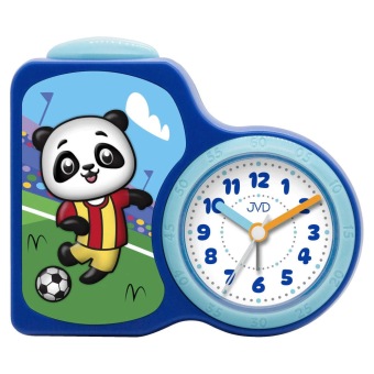 • Wekker SRP163-4J is een voetballende panda kinderwekker in een blauwe kunststof uitvoering met een verhoogde opgelegde panda.