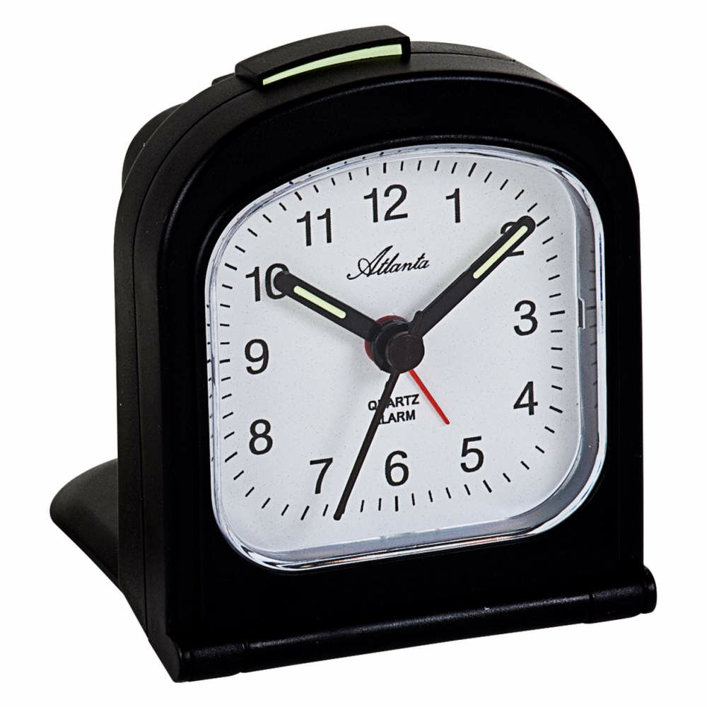 • Wekker 1267-7A is een reiswekker in een zwarte kunststof uitvoering met een glas voor de witte wijzerplaat.
