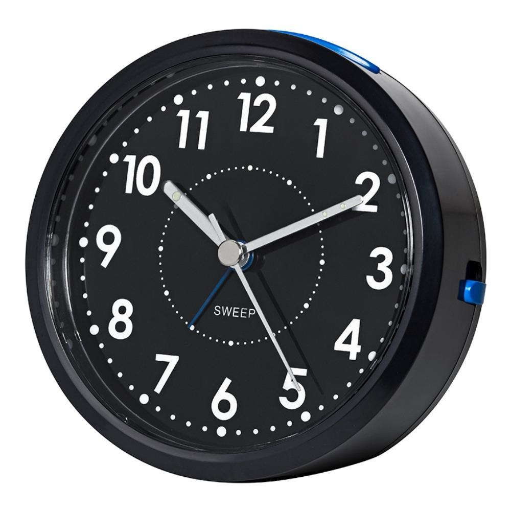 • Wekker 0528-7 is een zwarte wekker met blauwe knoppen, witte opgedrukte cijfers en zilverkleurige wijzers.