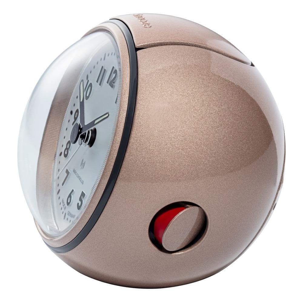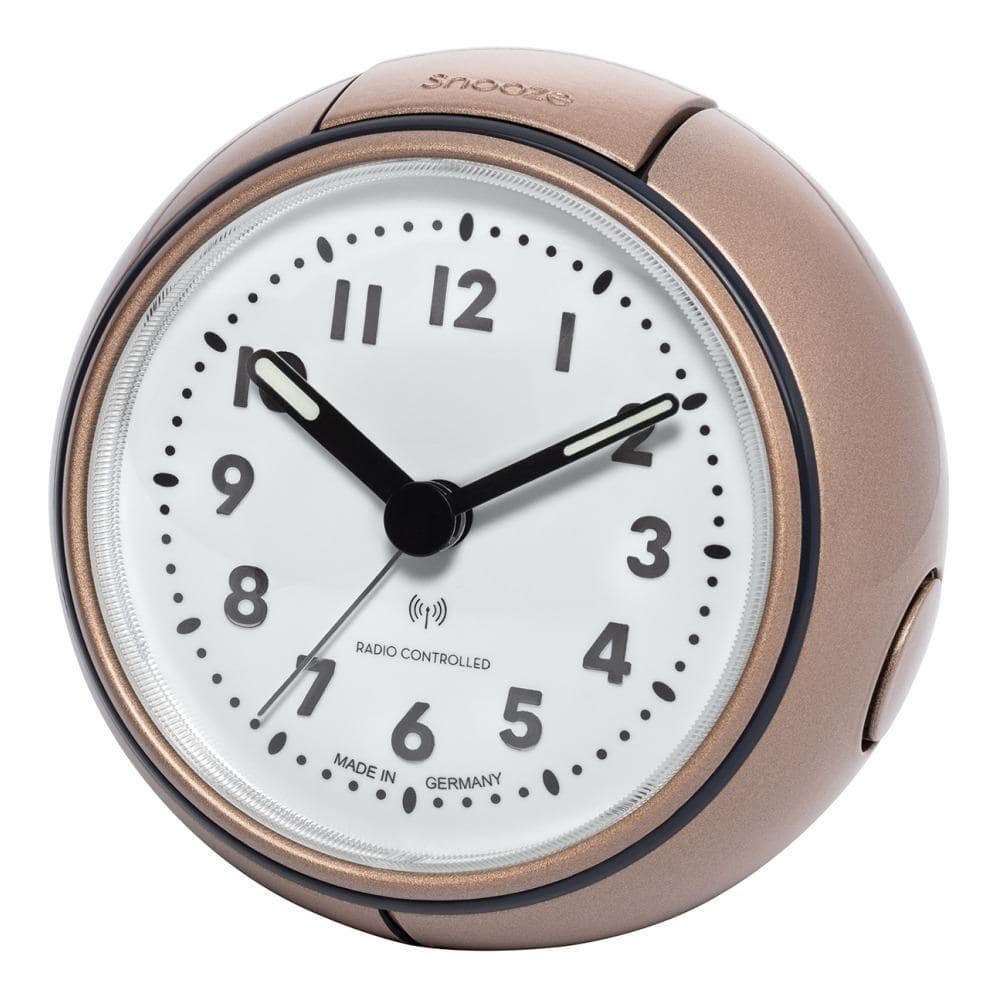• Wekker 0544-18 is een ronde kunststof wekker in een metallic champagnekleurige uitvoering waarbij de voorkant is ingelegd met een zwarte ring.