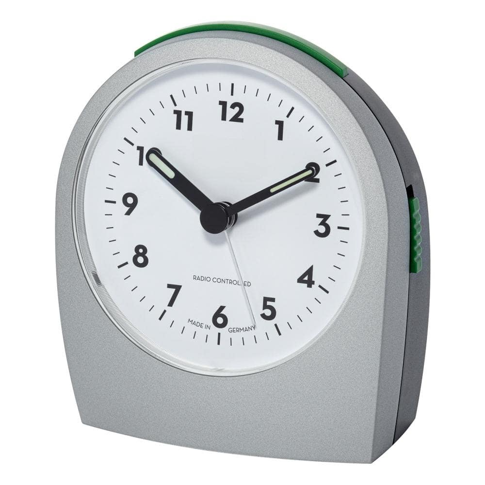 • Wekker 0545-19 is een kunststof wekker met een mat zilverkleurige voorkant, een mat antracietkleurige achterkant en groene knoppen.