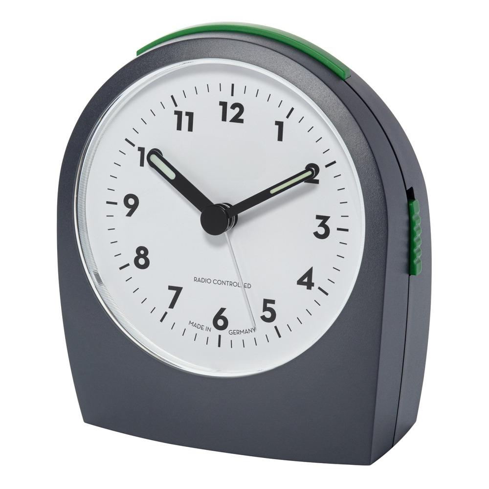 • Wekker 0545-4 is een mat antracietkleurige kunststof wekker met groene knoppen.