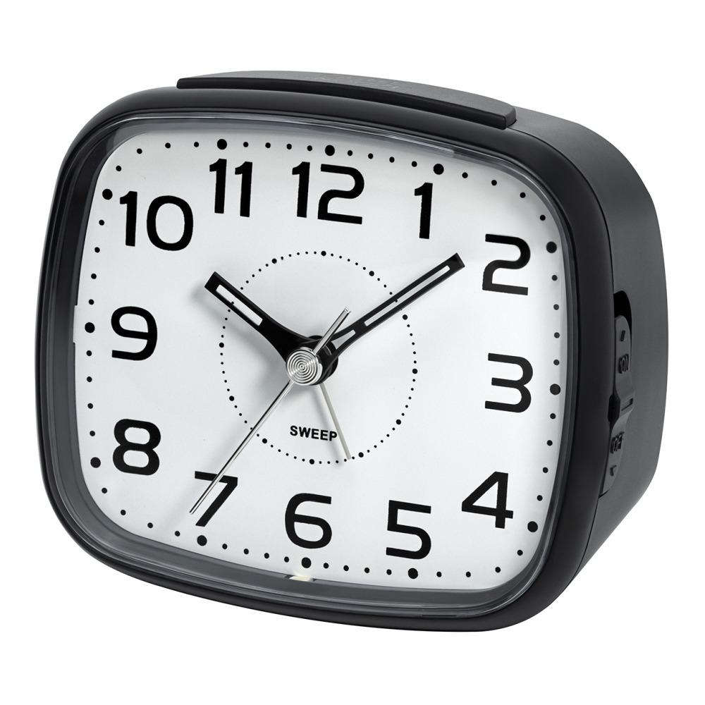 • Wekker 0604-7 is een zwarte kunststof wekker met een witte wijzerplaat, zwarte opgedrukte cijfers en zwarte open wijzers.