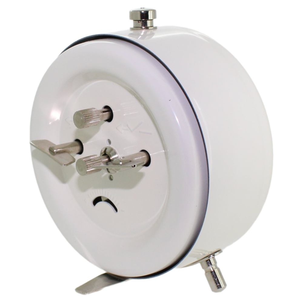 • Wekker 10-9549 is een mechanische wekker in een witte metalen uitvoering met chroomkleurige metalen pootjes, drukknop, opwindsleutels en verstelknop.